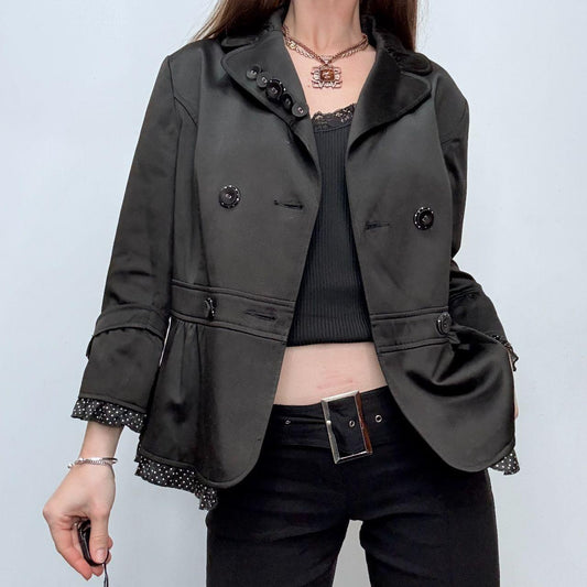 Black satin polka dot flared pea coat