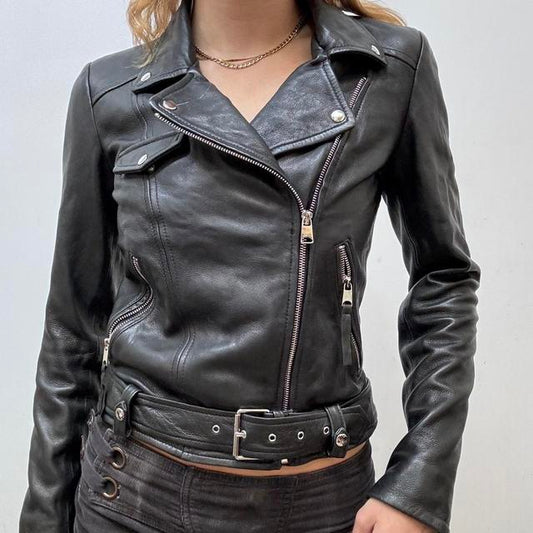 Cropped black leather biker jacket