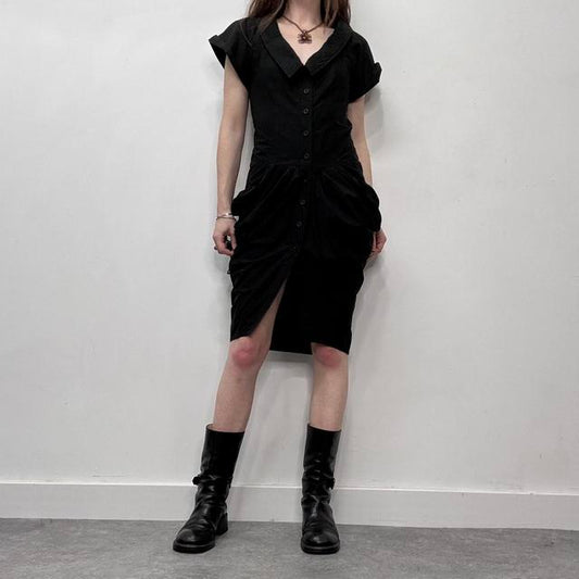 Black silk asymmetrical wide neck midi dress