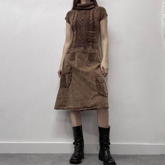 Brown distressed cable knit cargo denim dress