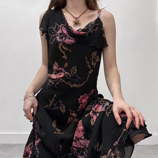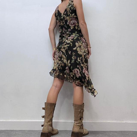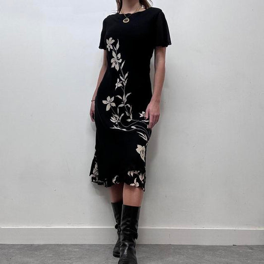 Sold outBlack silk graphic floral dress