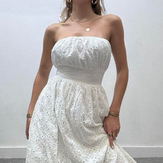 White embroidered cotton puff boob tube dress