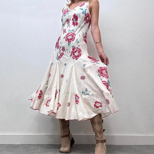 White flared bias cut floral maxi dress