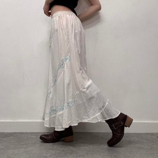 White cotton embroidered flared maxi skirt