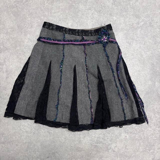 Grey wool tweed flared lace midi skirt