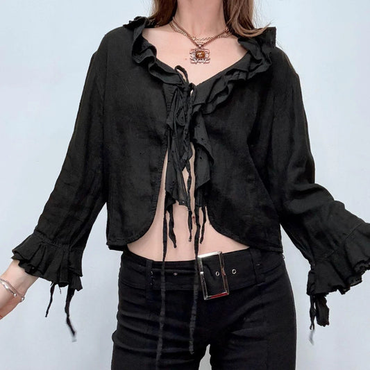 black ruffle linen flared tie up ruffle shirt