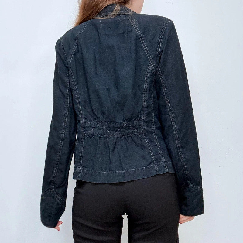 Vintage Asymmetric double collar and button crossover utility jacket, navy dark denim salvage style canvas jacket with contrast khaki tan panel, contrast stitch high neck button up flared grunge military utility 90s blazer jacket