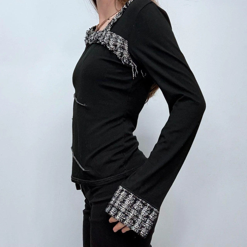 Vintage checked tartan tweed flared cuff and asymmetric wide neckline trim, embroidered details