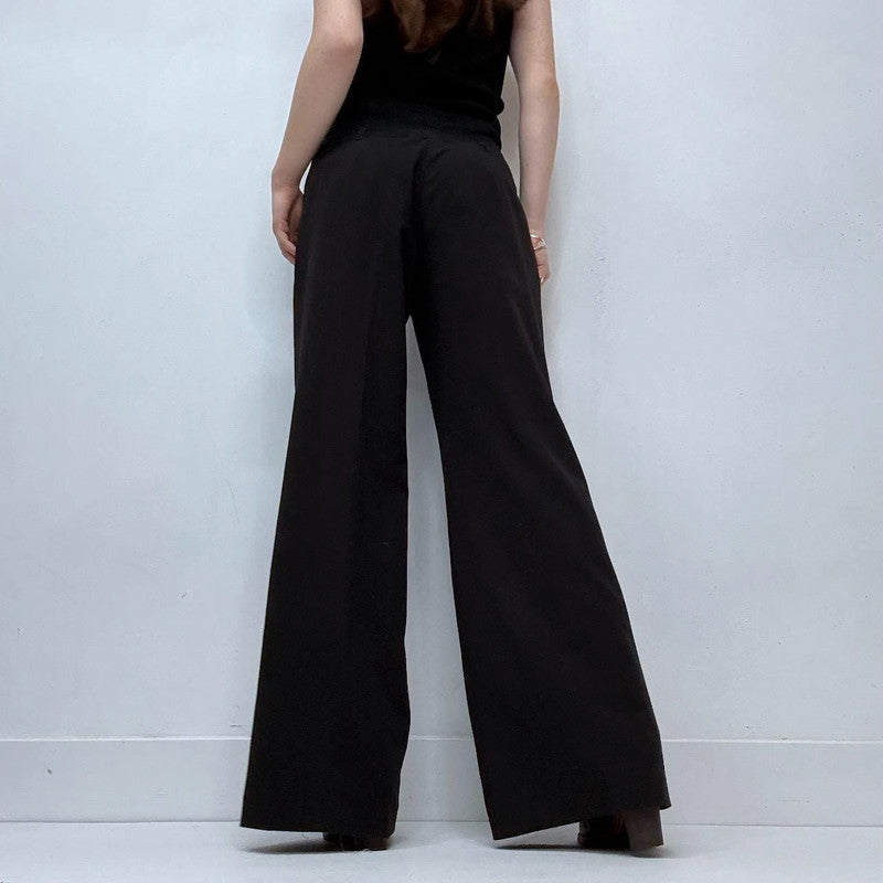 Vintage low-rise ribbed stretch waist, thick waistband wide-leg flared Cop Copine french designer minimalist trousers, preppy grunge style drop waist low-rise officecore trousers with front cargo utility zipper.