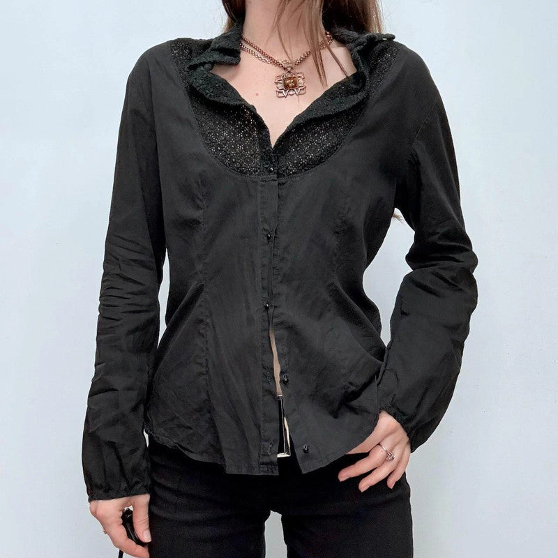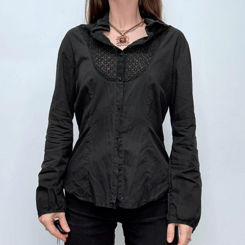 Vintage black lace collar boho hippy grunge style fitted office siren style 90s cotton blouse.