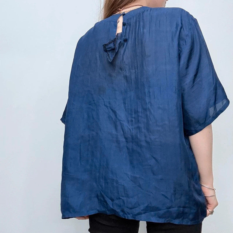 Vintage minimalist flared slouchy baggy stitched oversized high neck top, floaty sheer 100% silk simple flutter blouse in blue and collar stitching details.
