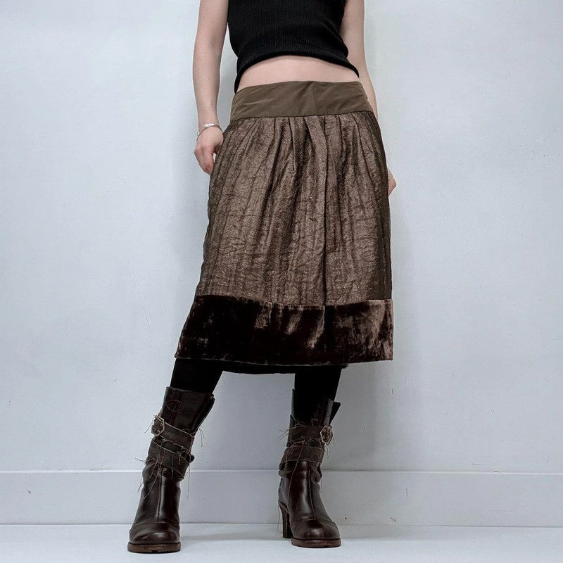 Vintage pleated fairy midi skirt, low rise thick waistband boho flared velour hem skirt