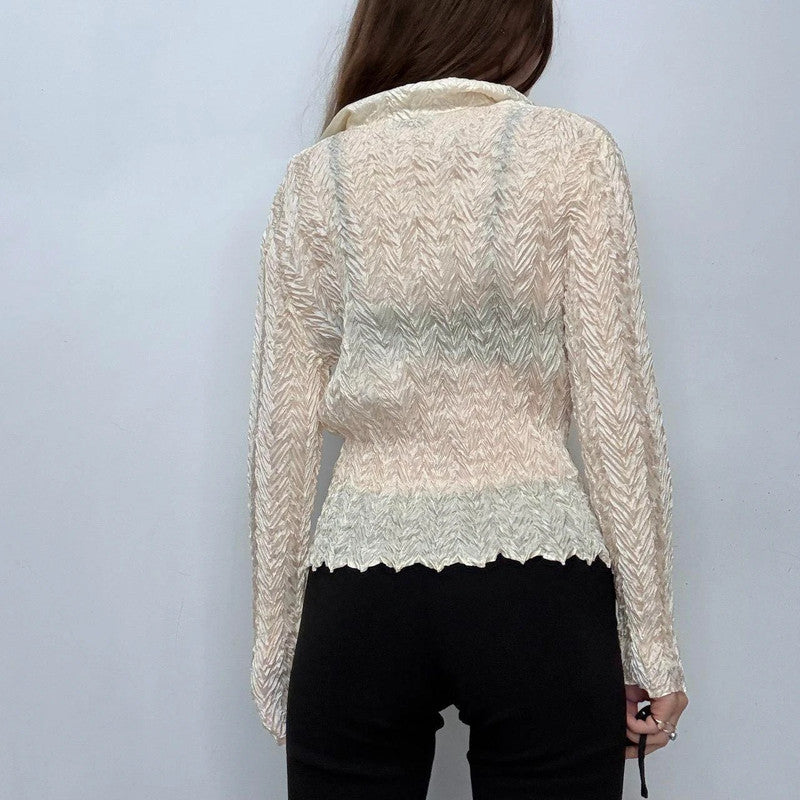 Vintage silk sheer textured crinkle fitted cream satin shirt, button up preppy sheer shibori crunch textured shirt with fold over collar. Officecore lace hem style.
