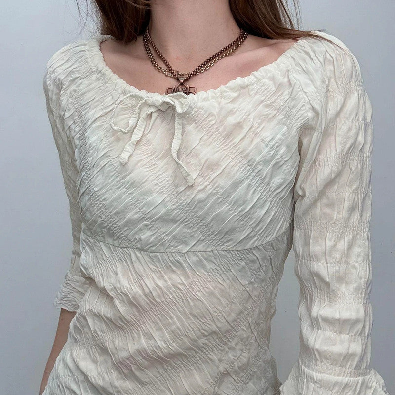 Vintage boho slash neck flared white cottage shirt, tie up cinched wide neck in crinkle Lacey boho flare blouse.