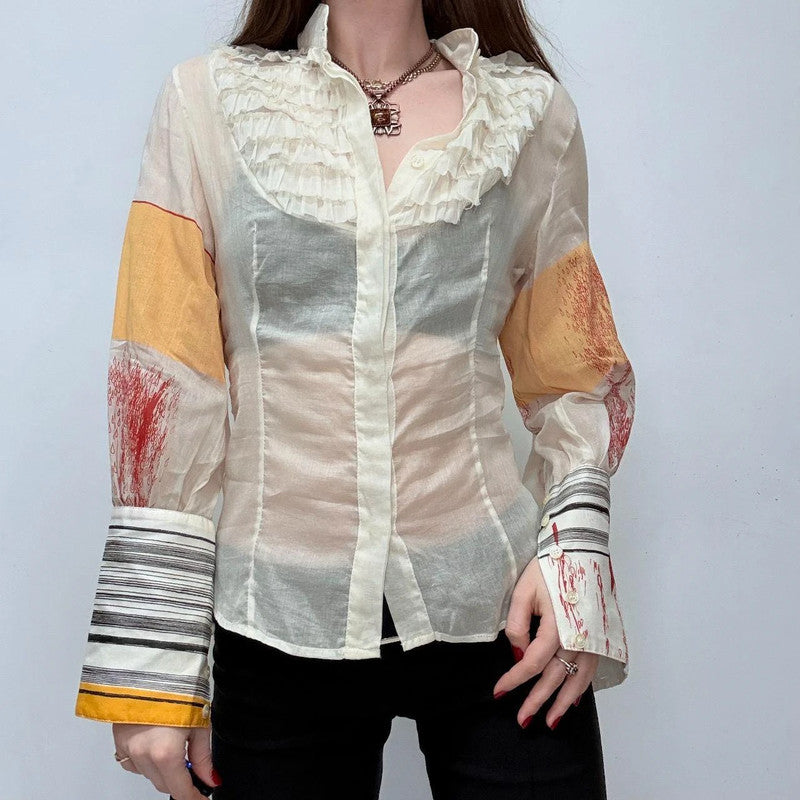 Vintage cream ruffle baroque Regency style shirt, oversized flat cuffs boho with graphic print, sheer cotton Fitted hippy frilly shirt.