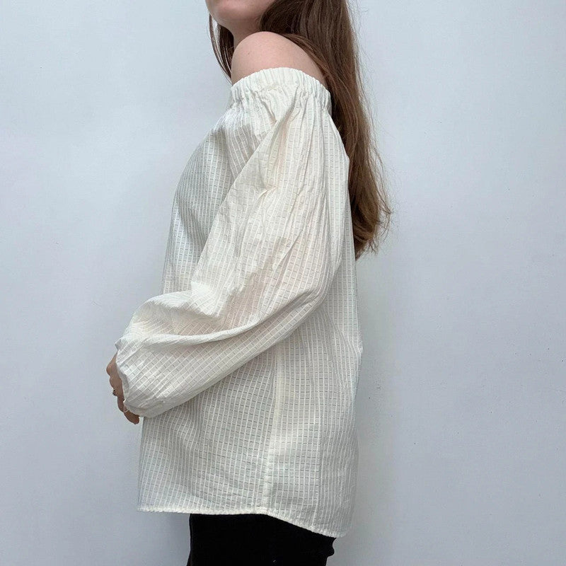Massimo Dutti cream fine checked pinstripe square textured puff sleeve wide neck flared summer boho puffy shirt