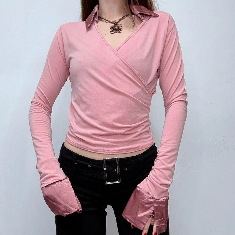 Vintage Fitted pink wrap over preppy flared officecore shirt, stretch crossover contrast satin flared cuff cropped T-shirt