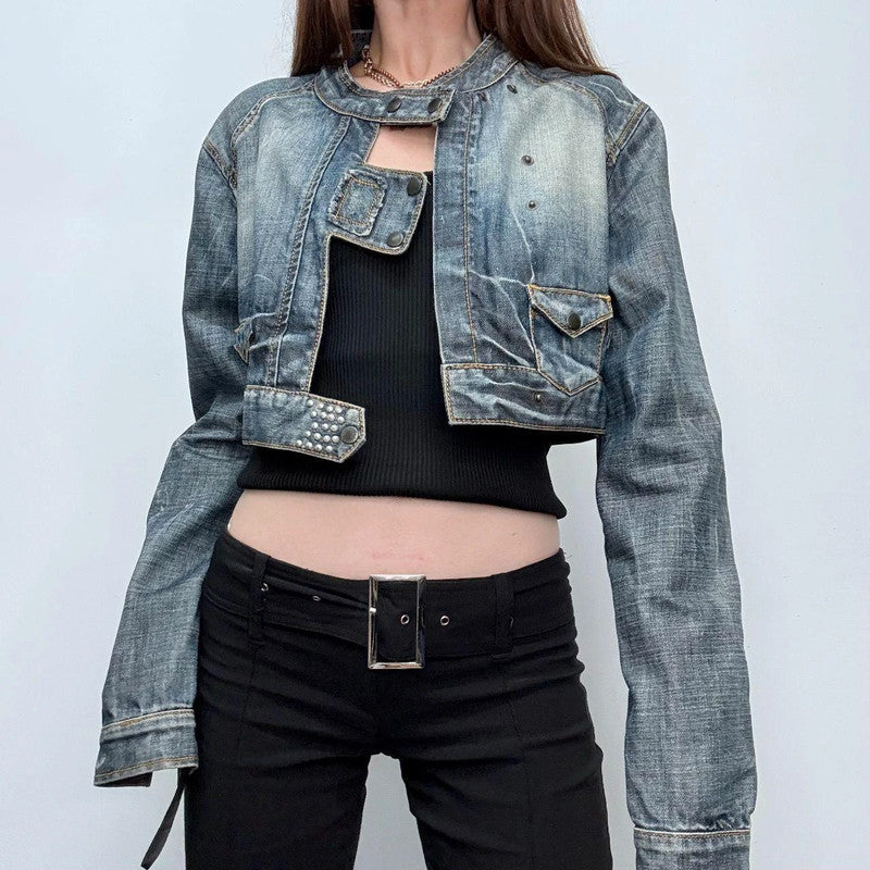 Vintage studded cargo details, studded style belted hem, cross over utility punk jacket, cropped boxy fit, grunge y2k Spanish designer euro summer jacket