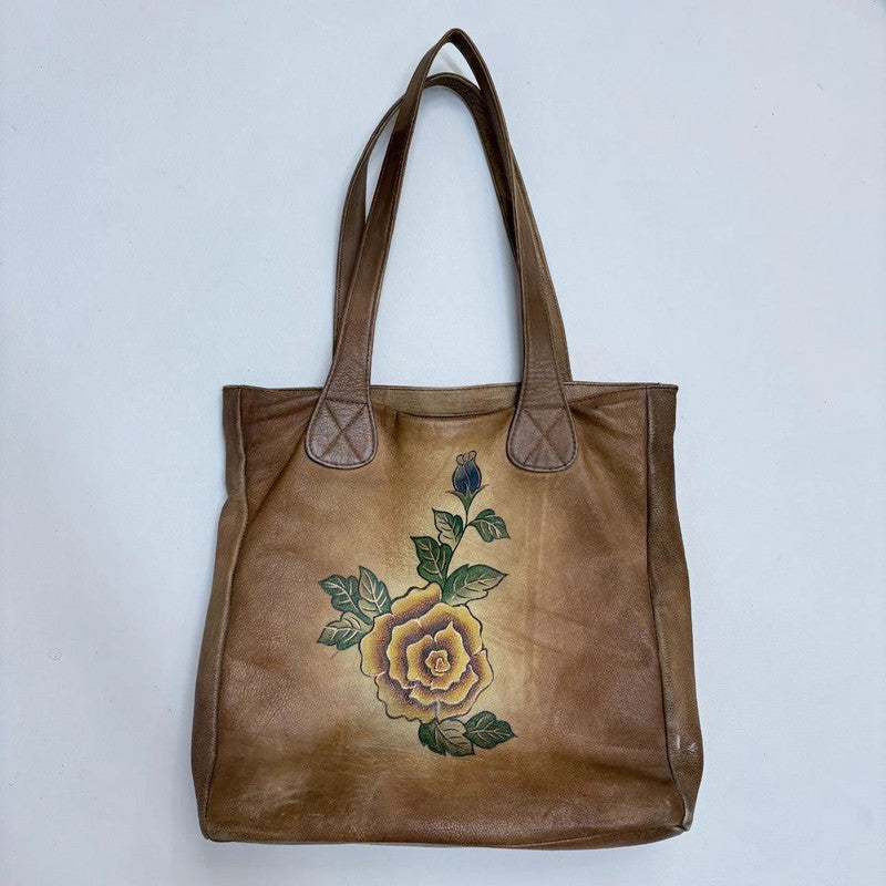 Vintage tan leather painted rose tote handbag bag, grunge gothic floral shoulder bag tote style bag