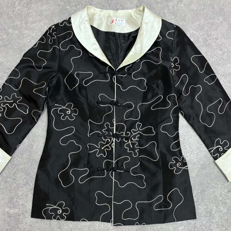 Vintage black and white flared structured antique style jacket with oversized cuffs and contrast abstract embroidery, ornate military edwardian style