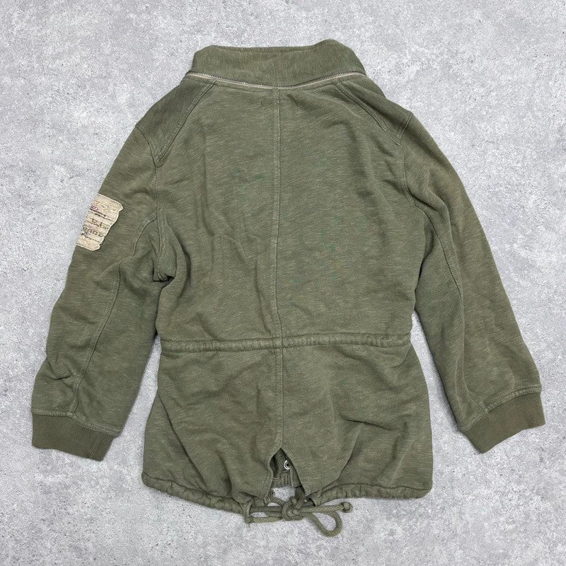 Vintage slouchy khaki cargo zip-up hoodie zip up jacket with oversized utility grunge pockets - military style with hanging cords, cinch waist and patches with cropped sleeves.