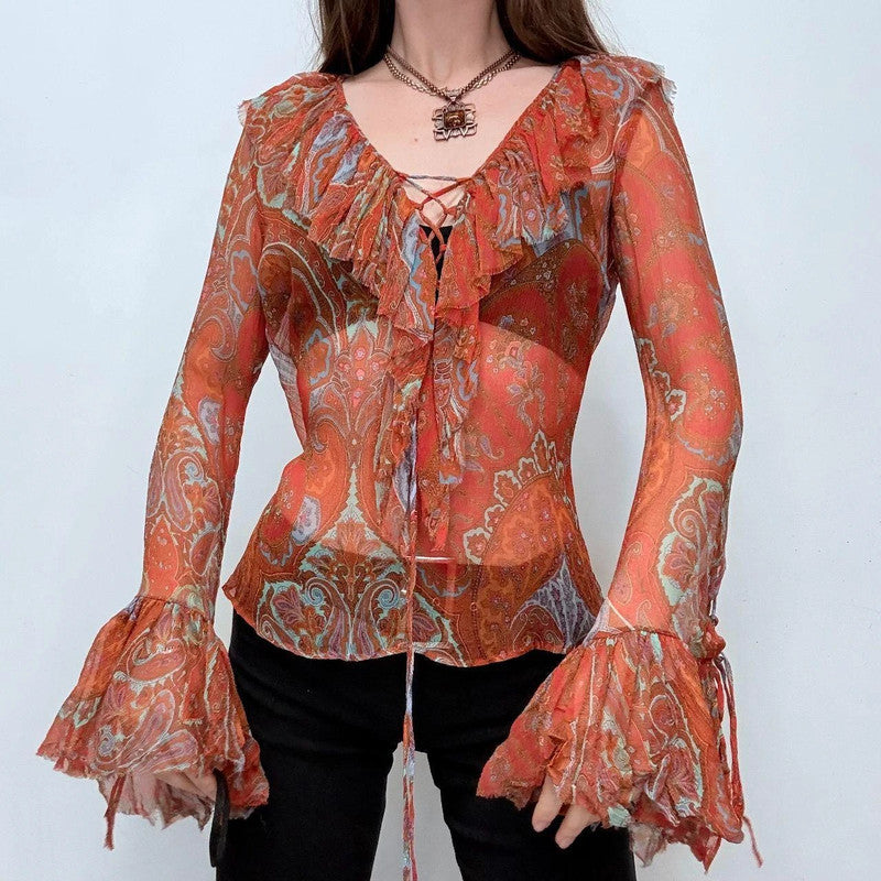 Vintage boho hippie flared sleeve lace up neckline, fairy flutter floaty silk shirt with lace up corset front, boho festival paisley print shirt with bell flare ruffle sleeves
