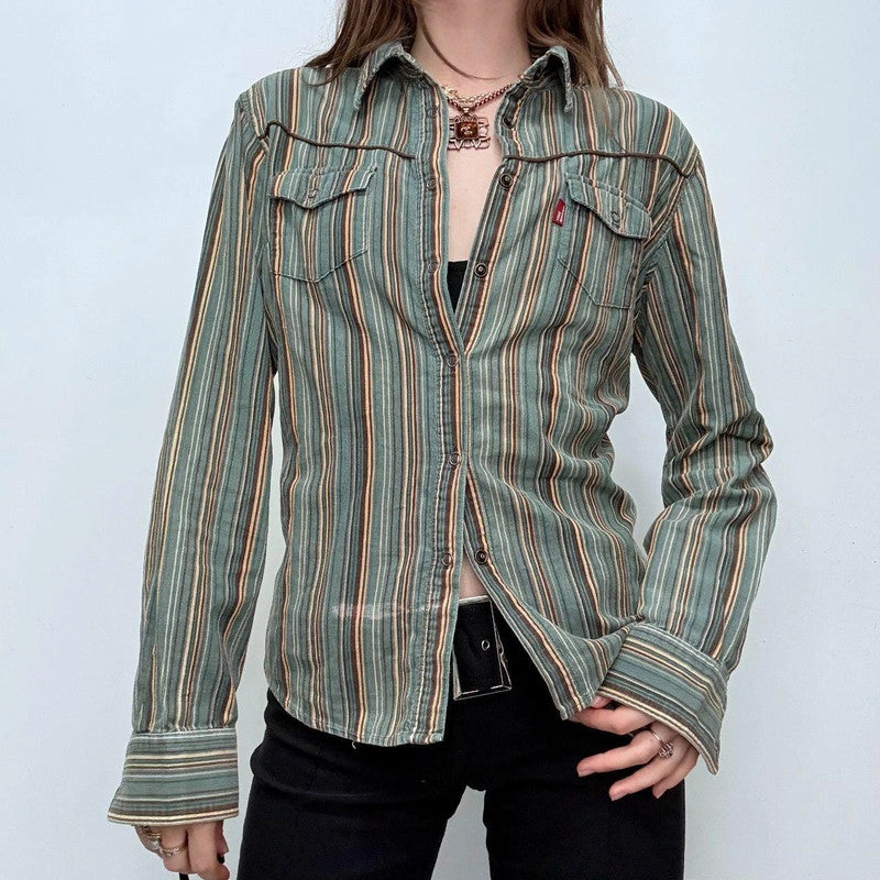 Vintage western style corduroy popper flared shirt, striped earthy tone cord boho Y2K fitted grunge shirt