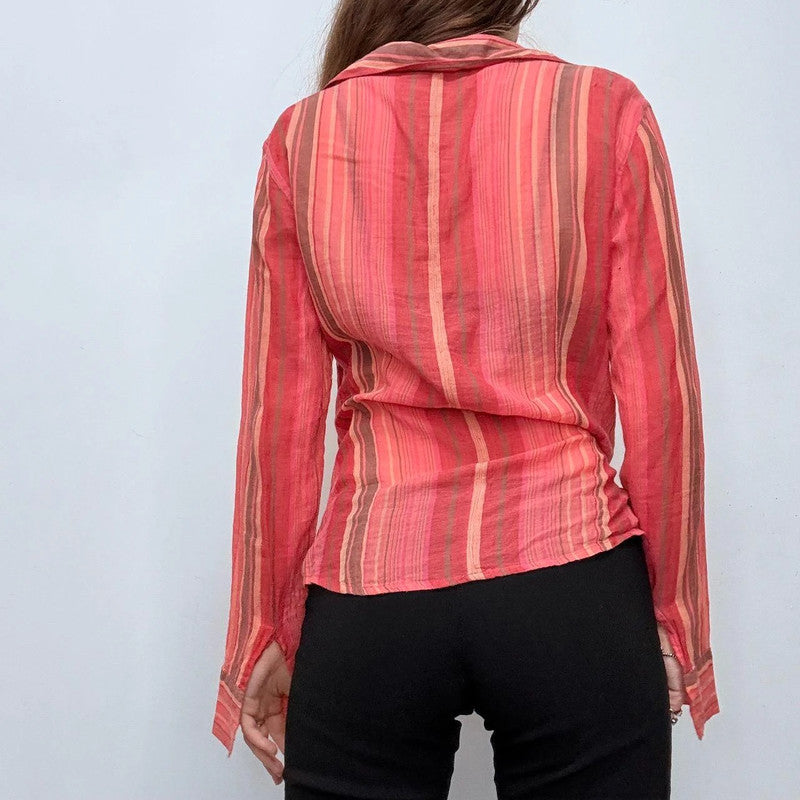 Vintage boho hippy Y2K 90s style salmon pink slouchy fine cotton semi-sheer flare 1/4 button shirt with utility style cargo pockets .