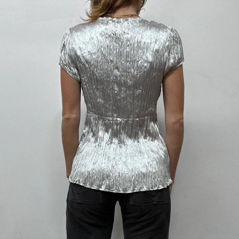 Vintage silver chrome style pleated shirt blouse with v-neck style front. floaty flutter tech style top.
