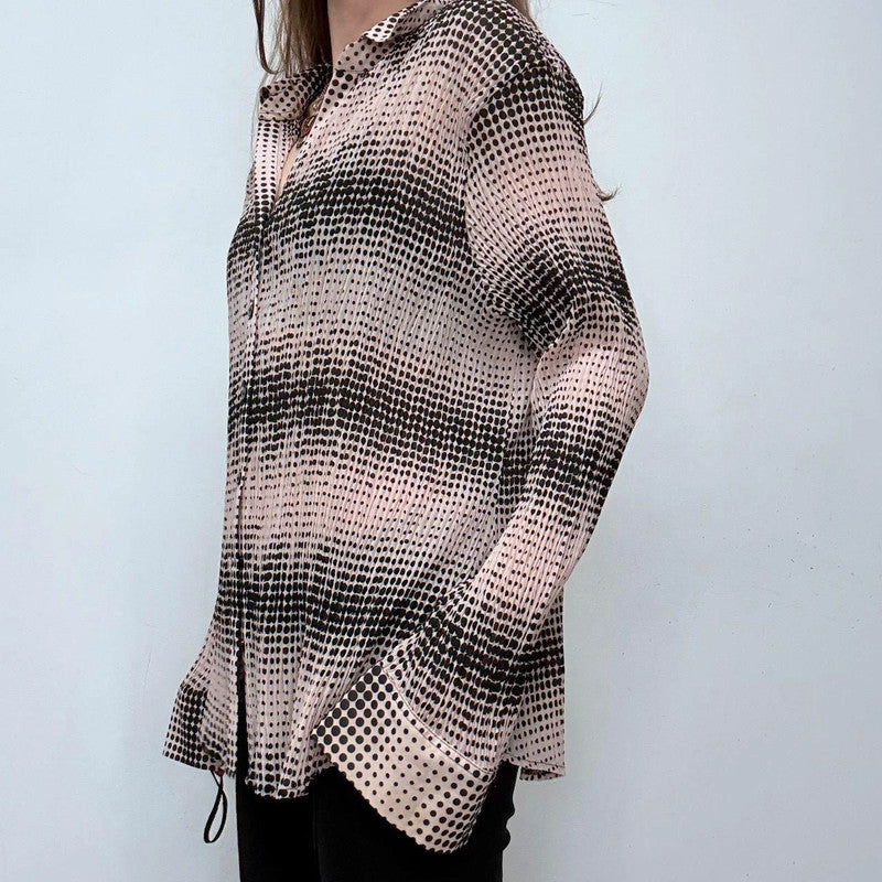 Vintage pleated Polkadot pink and black crinkle fitted flare shirt, faded stripe textured pleat material button up shirt, grunge preppy Y2K style