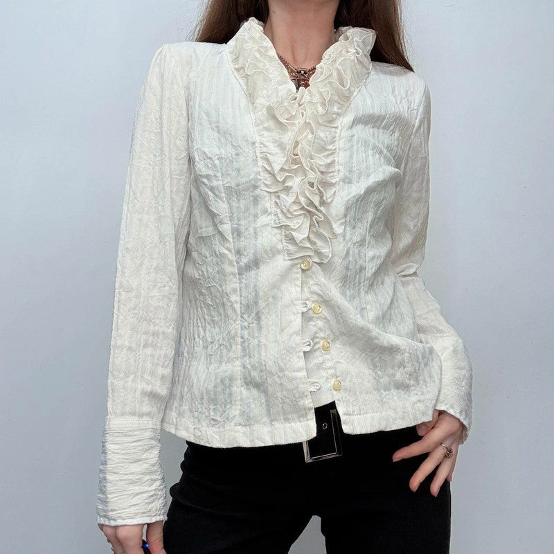 Vintage coquette baroque style flutter neckline button up shirt, regency cottage style textured pinstripe cream shirt